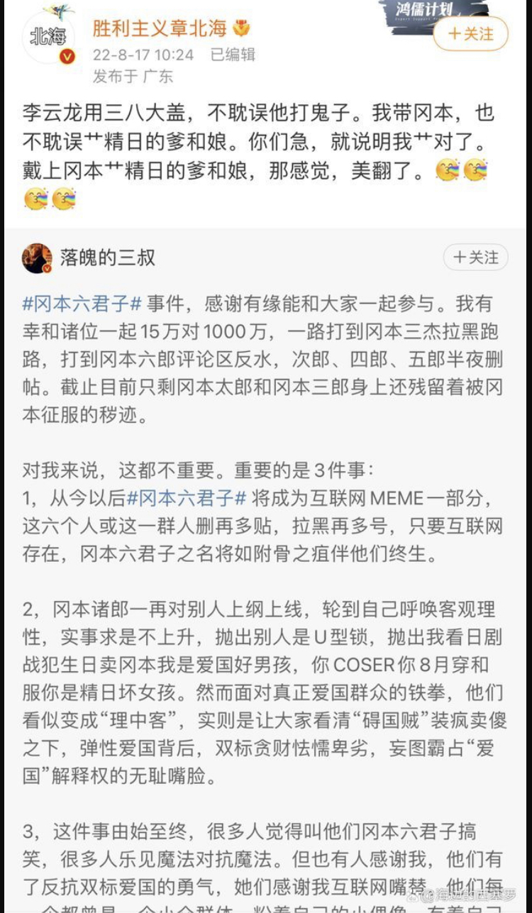 而抛去这些污言秽语,“六君子”们辩白思路是一样的——他们说,自己虽然给日本带了货,但心依然是中国心,带了日本的避孕套,不妨碍他们继续割流量韭菜……啊,不对,“x翻日本人”!